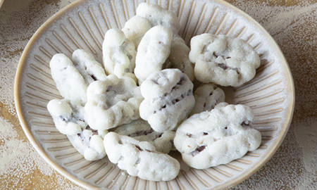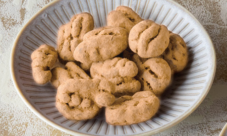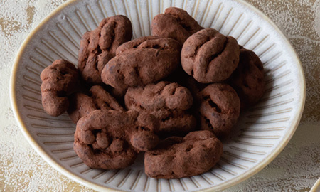 軽くローストしたペカンナッツに、ホワイトチョコレートでコーティング。更にキャラメルパウダーで包みました。ペカンナッツの香ばしさとキャラメルの風味が口の中で広がる、一度食べたらとまらないおいしさ。