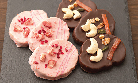 フルーツをフリーズドライ加工し、チョコレートを染み込ませたさっくり、しっとり食感のチョコレートスウィーツと、ホワイトチョコレートをコーティングしたナッツ。