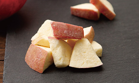 国産りんごをフリーズドライ加工し、ホワイトチョコをしみ込ませました。りんごの酸味、甘さと、クリーミーなホワイトチョコの甘さをあわせ持つスウィーツです。