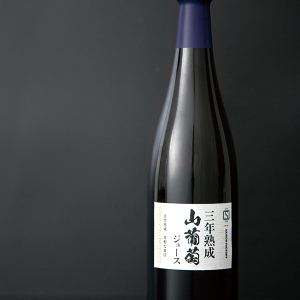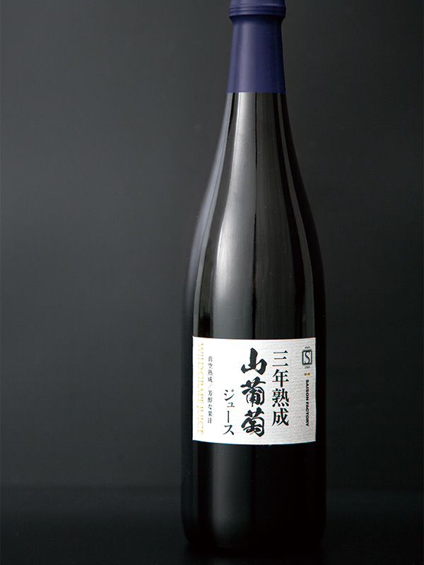完熟した山ぶどうを搾った100%果汁。真空状態で3年以上にも及ぶ低温熟成を行い、甘みと味わいに深みを持たせた濃厚な仕上がり。