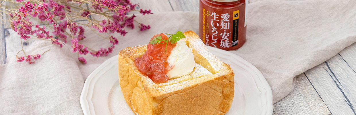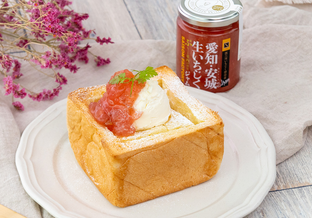 厚めにカットした食パンにたっぷりバターをしみこませたトースト。こんがり食感に冷たいアイスと安城いちじくジャムをプラスし、リッチに仕上げました。