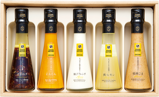 定番人気ドレッシングのにんじんとたまねぎに、カルパッチョなどにもお使いいただけるさっぱりとしたレモン、柚子の優しい香りと爽やかな酸味がおいしい柚子フレンチと、ごまの香りがおいしい焙煎ごまを加えた、お料理のバラエティー広がるドレッシングギフト。