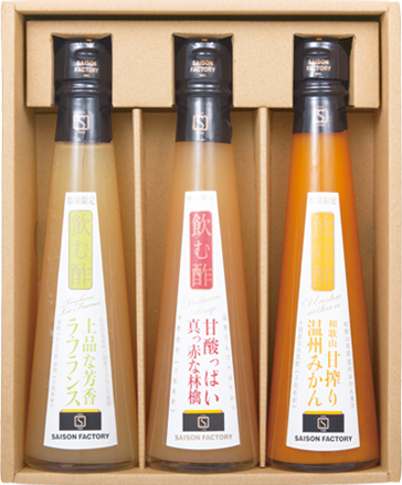冬の飲む酢の3本詰合せ。芳醇な香りのラ・フランスと、甘酸っぱい真っ赤な林檎、濃厚な味わいの温州みかんを詰合せました。