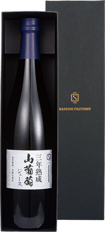 完熟した山ぶどうを搾った100%果汁。真空状態で3年以上にも及ぶ低温熟成を行い、甘みと味わいに深みを持たせた濃厚な仕上がり。